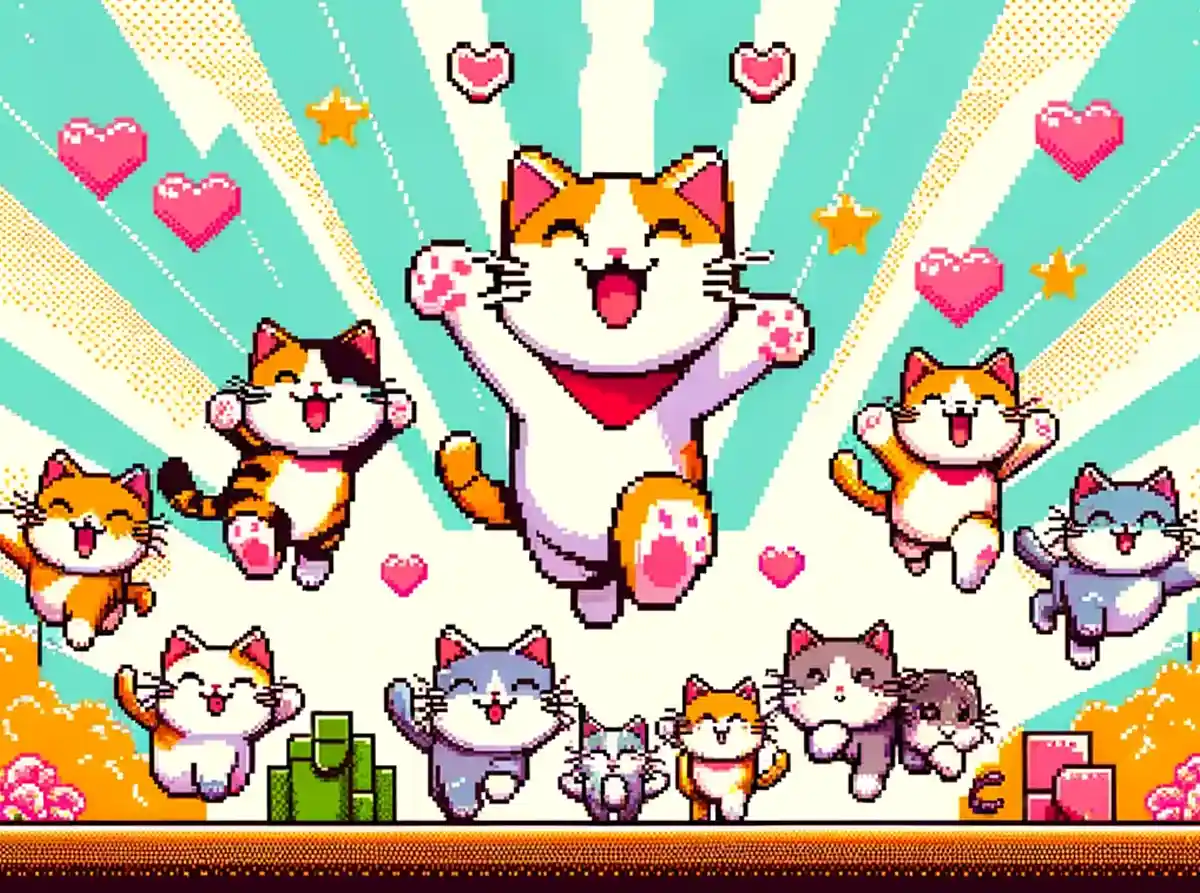かわいい猫と一緒にレトロゲームの世界を飛び跳ね!たい焼きを集めながら新しいハイスコアを目指そう!