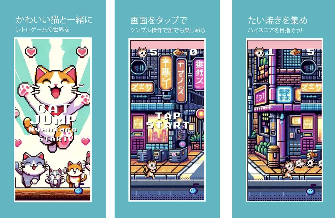 かわいい猫と一緒にレトロゲームの世界を飛び跳ね!たい焼きを集めながら新しいハイスコアを目指そう!