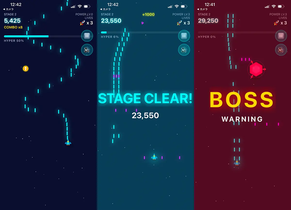 ゲージが溜まると「ハイパーモード」が発動可能になり、一気に火力が跳ね上がる爽快タイムへ突入。短時間でサクッと遊びたいカジュアル層から、スコアアタックが好きなコアゲーマーまで楽しめる一本です。